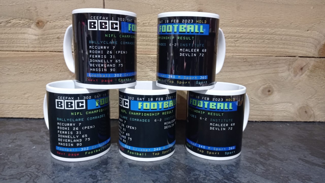 Our recent 6-2 Championship win over Institute in the classic version of Ceefax on a mug